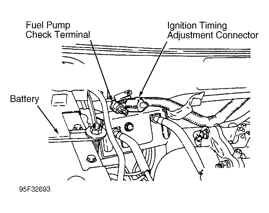 3. Apply battery voltage to fuel pump check terminal. Fuel pump check terminal is a 1-pin Black connector located on firewall, near battery and contains a Black/Blue wire. See Fig 1 . Check for fuel leaks. Disconnect battery voltage from fuel pump check terminal.