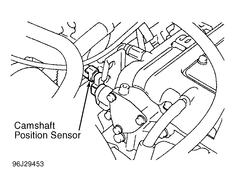 - Camshaft position sensor is located at rear of cylinder head on intake manifold side of engine. See Fig 1. Disconnect connector from camshaft position sensor. Remove bolt, camshaft position sensor and "O" ring.