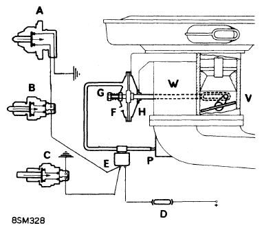 See Fig 1. Switch "A", on transmission, is closed when third or fourth gears are engaged. Switch "B", installed close to clutch pedal, is closed when pedal is released. When both switches are closed (in third or fourth gear with clutch pedal released) solenoid valve "E" is energized and vacuum from intake manifold actuates fast idling diaphragm unit "H", on carburetor. When transmission is in any gear other than third or fourth, or if clutch pedal is depressed, fast idling device is inoperative. As a result, when vehicle is standing still with engine idling, switch "A" is open. However, a push-button switch "C", mounted on firewall or sidewall of engine compartment depending on car model, allows solenoid valve "E" to be energized in order to adjust fast idling speed. Adjustment is obtained through adjustment screw "G" on vacuum diaphragm unit. This system is fused through windshield wiper circuit, thus, if wiper circuit is in operative, emission device will not function.