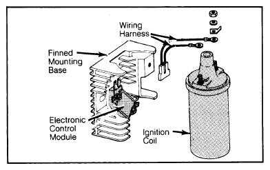 The control module and ignition coil are mounted on a finned, cast aluminum base which not only cools the units, but also provides the system ground. See Figure.