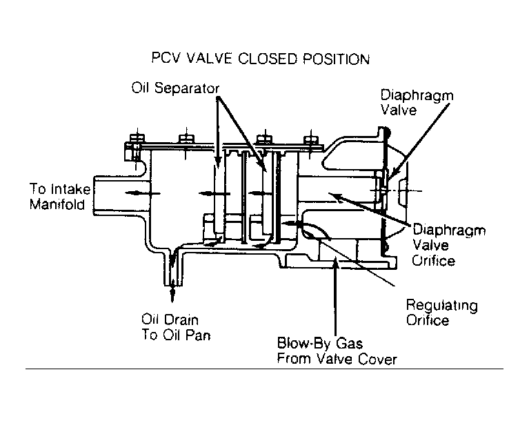Remove PCV valve cover and check for deterioration or damage to diaphragm. Check diaphragm for breakage. See Figure . Check PCV valve body for contamination. Check baffle plate, located inside valve cover, for contamination and plugging.