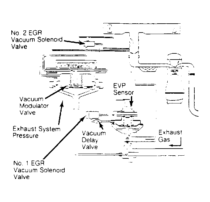 The modulator valve will allow vacuum to pass through only when sufficient exhaust system backpressure has developed to close the internal bleed hole of the modulator diaphragm. When backpressure has closed the bleed, vacuum signals can then react upon the modulator diaphragm. When the modulator diaphragm rises, vacuum signals from the No. 2 EGR solenoid valve can then pass through the modulator to the No. 1 EGR vacuum solenoid, check valve and EGR valve diaphragm.