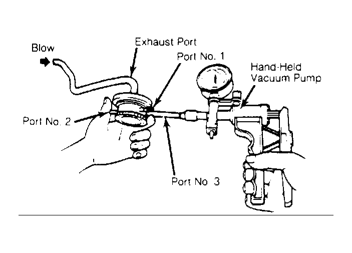 2. With a hand-held vacuum pump, apply 7 in. Hg to port No. 3 of modulator. Vacuum should hold. Release pressure from exhaust fitting hose to open diaphragm bleed. Vacuum on gauge should drop. If valve does not perform as stated, replace modulator valve.