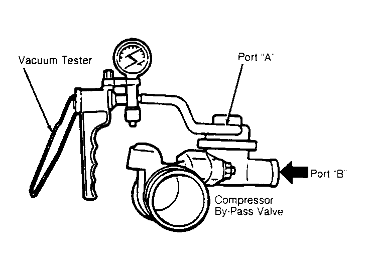 With compressor by-pass valve removed from the vehicle, apply a vacuum of 9.8-15.7 in. Hg to port "A" of the valve. See Fig 1 . Blow through port "B" to verify air flows. If air does not flow, replace compressor by-pass valve.