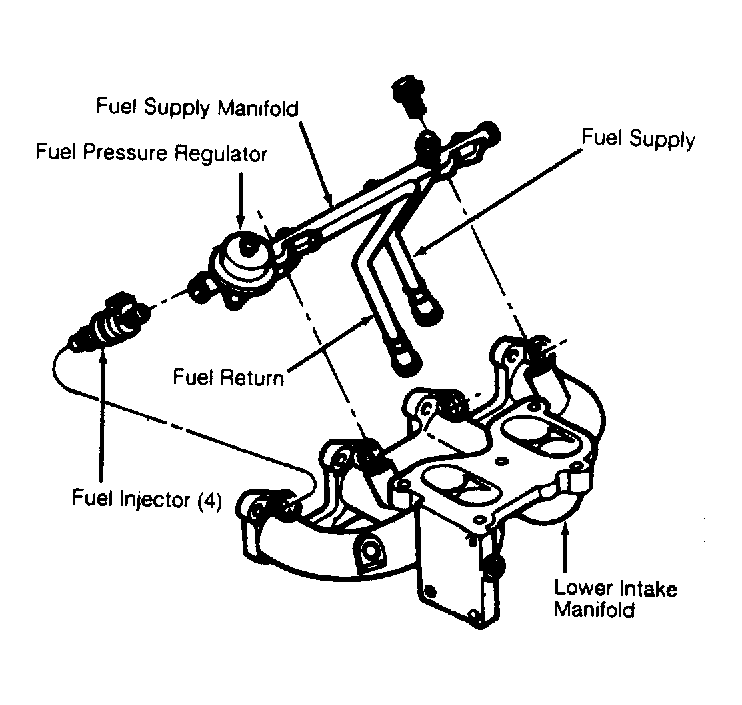- Disconnect wiring harness from injectors. Remove fuel supply manifold retaining bolts. Carefully disengage manifold and fuel injectors from engine. Remove manifold and injectors. See Fig 1