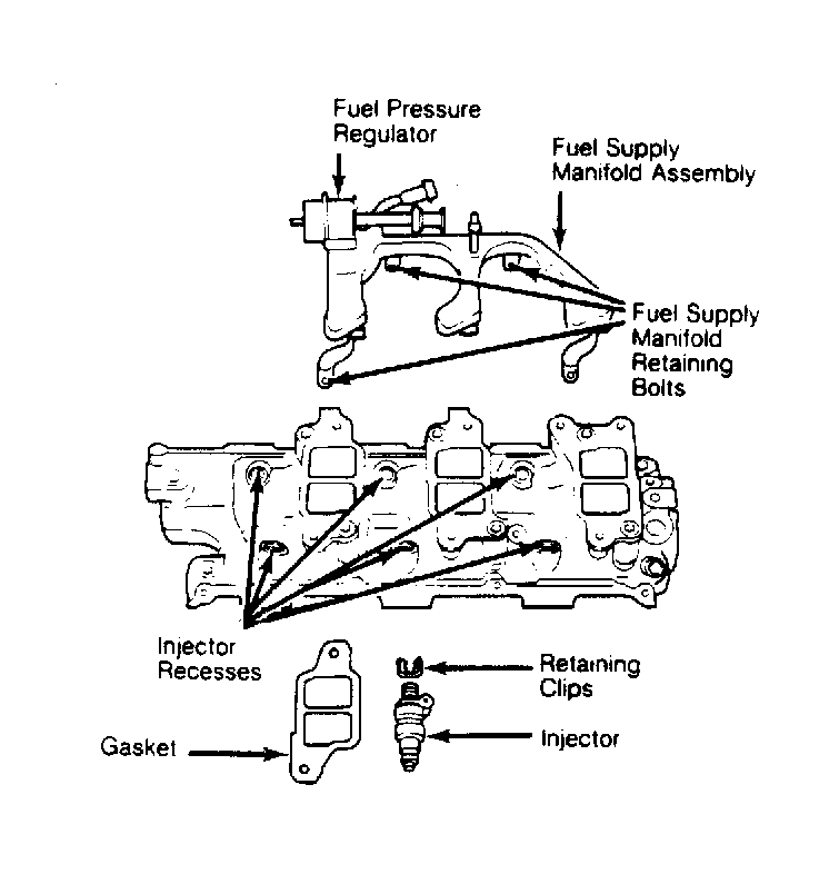 - Remove fuel supply manifold retaining bolts. Carefully remove fuel supply manifold from lower intake manifold. The fuel injectors are retained in fuel supply manifold with clips.