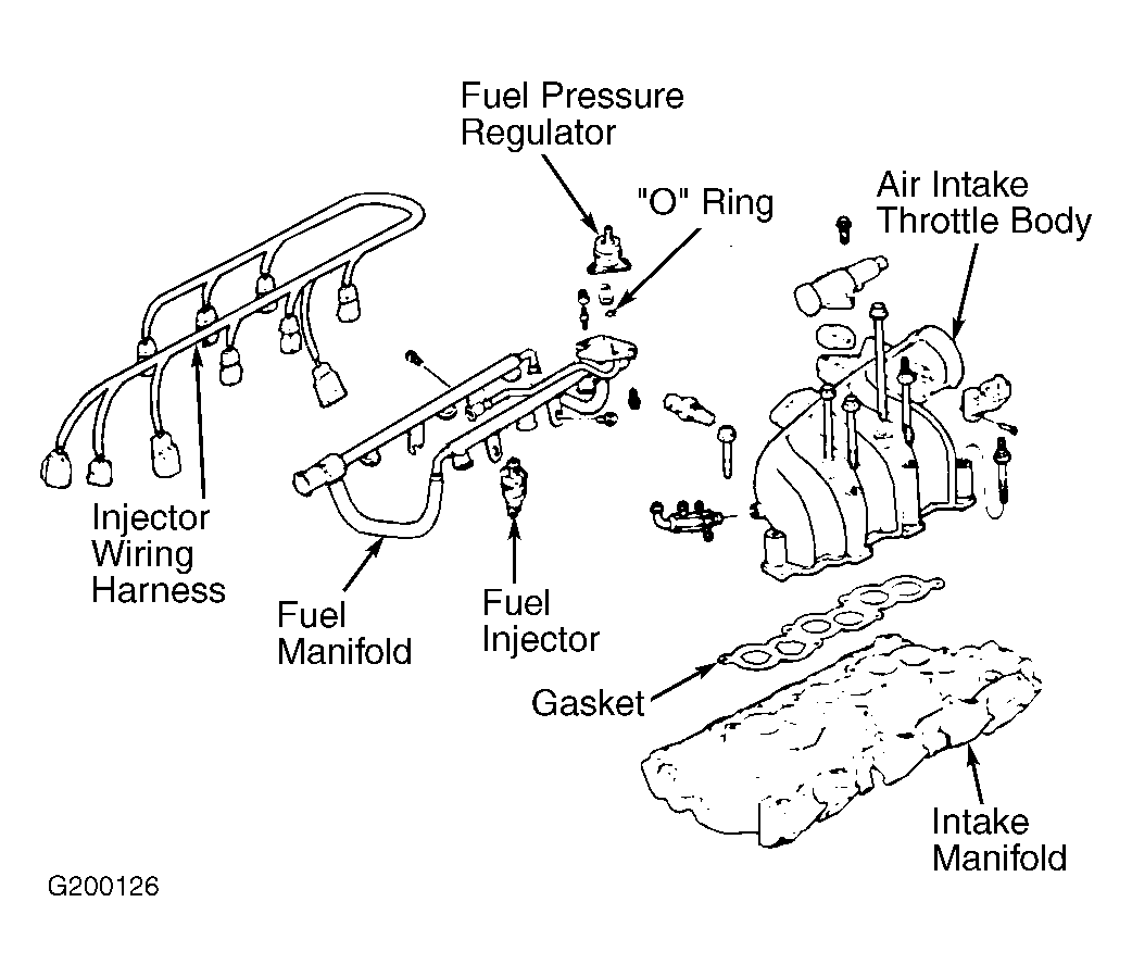 - Remove air intake throttle body. See AIR INTAKE THROTTLE BODY. Depressurize fuel system. Relief valve is located on fuel supply line. Disconnect fuel supply and return lines. See PUSH-CONNECT FITTINGS. Disconnect wiring harness at fuel injectors.