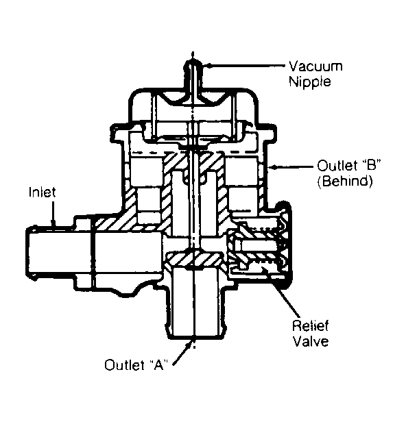 . Carefully remove vacuum line at vacuum nipple. Accelerate engine to 1500 RPM. Airflow should be heard and felt at outlet "B" with little or no airflow at outlet "A".