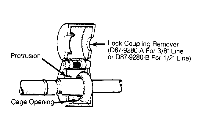 - Using Spring Lock Coupling Remover (D87L-9280-A for 3/8" or D87L-9280-B for 1/2"), remove clip from coupling. Place remover over coupling so protrusion is positioned on cage opening side of coupling. See Fig 1 .