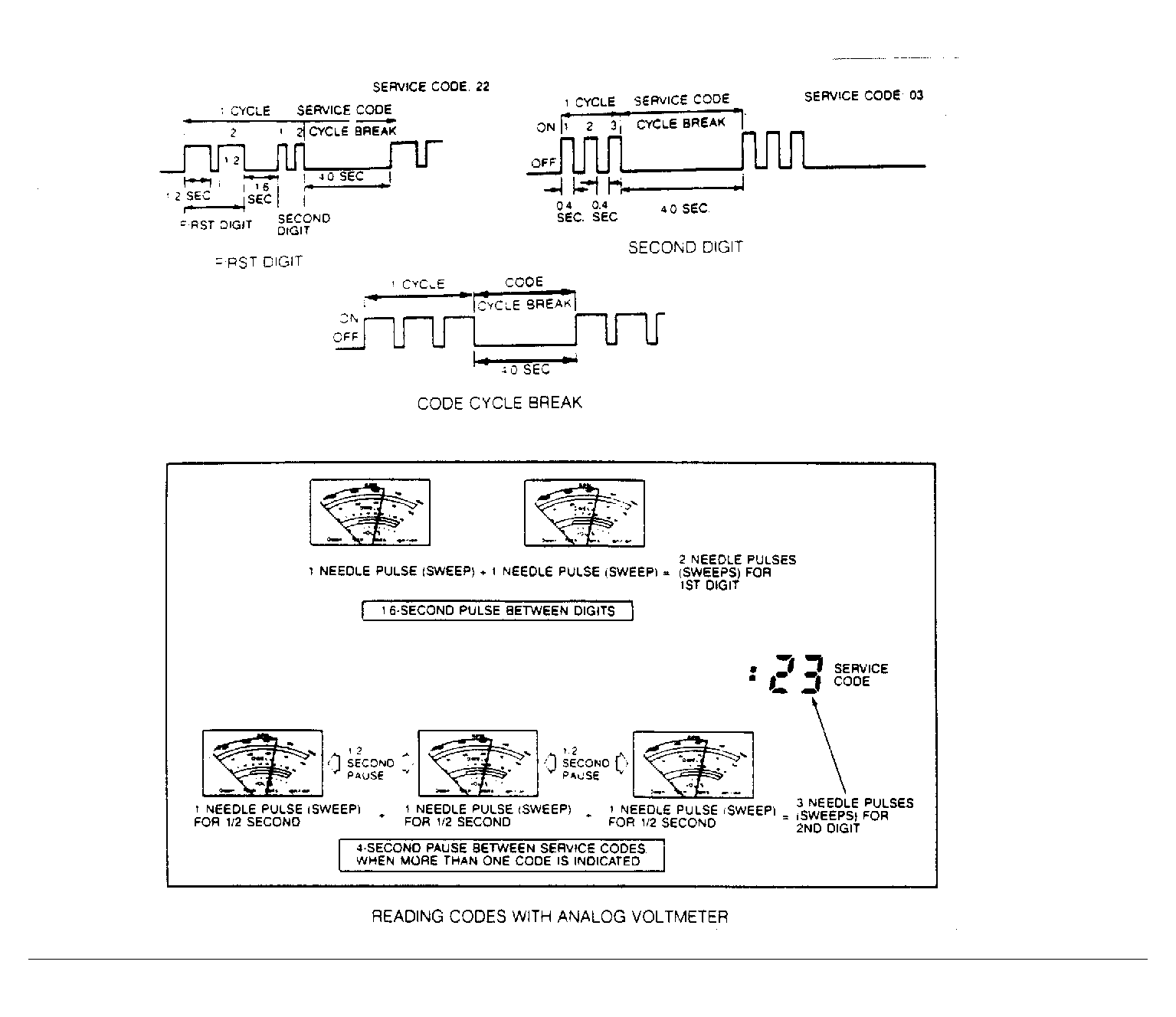 8) Start engine and allow to idle. Ensure VOM is connected as described in step 2). Record all codes displayed and repair fault as necessary. Refer to CODE REFERENCE CHART to determine the correct CIRCUIT TEST. If no code is present, go to ANALOG VOLT-OHMMETER (VOM) under SWITCH MONITOR TEST .