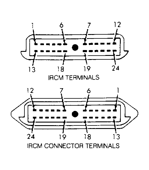2. Turn ignition on. Measure voltage between IRCM terminal No. 5 and ground. See Fig 1 . If voltage is greater than 10.5 volts, go to step 4). If voltage is not greater than 10.5 volts, turn ignition off. Disconnect IRCM wiring harness connector.