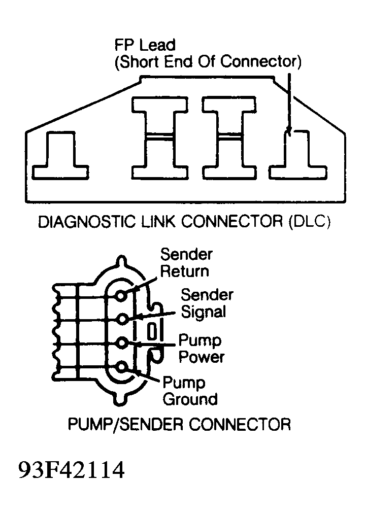 5. If fuel pressure is zero, ensure battery is fully charged. Ensure connection is okay at pump/sending unit. Turn ignition off. Using a jumper lead, ground FP terminal at Diagnostic Link Connector (DLC). See Fig 1. Turn ignition on, leaving engine off. Listen for sound of fuel pump. If pump is running, go to next step. If pump is not running, go to step 7).