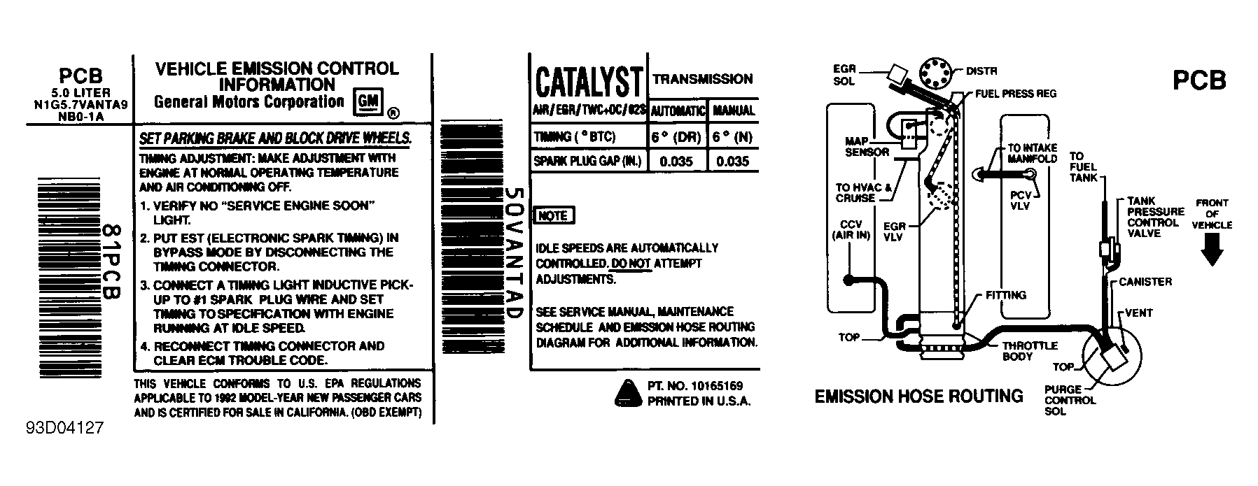The vehicle manufacturer's emission control label, also known as the underhood tune-up label or Vehicle's Underhood Emission Control System (VECI) label, is located in the engine compartment. Information regarding year model of vehicle, engine size, number of cylinders, emission equipment or type, engine tune-up specifications, whether vehicle was manufactured for sale in California or is a Federal vehicle, vacuum hose routing schematic, etc., can be found on this label. See Fig 1.