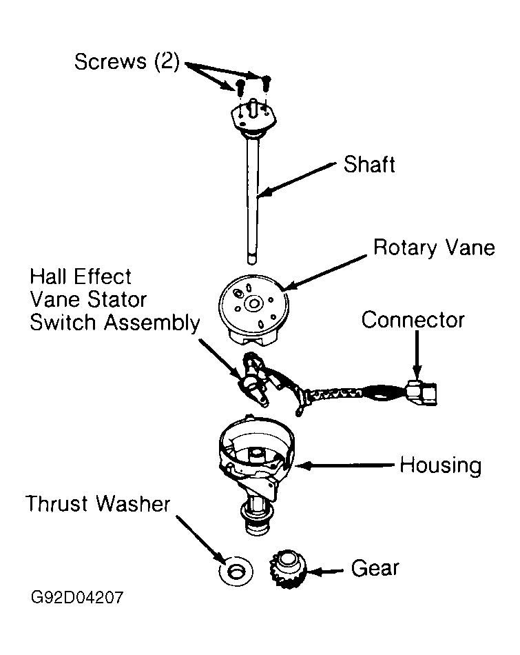 4. Remove thrust washer from distributor (if equipped), and save for installation. Remove screw and octane rod assembly (if equipped). Remove stator assembly screws and stator.