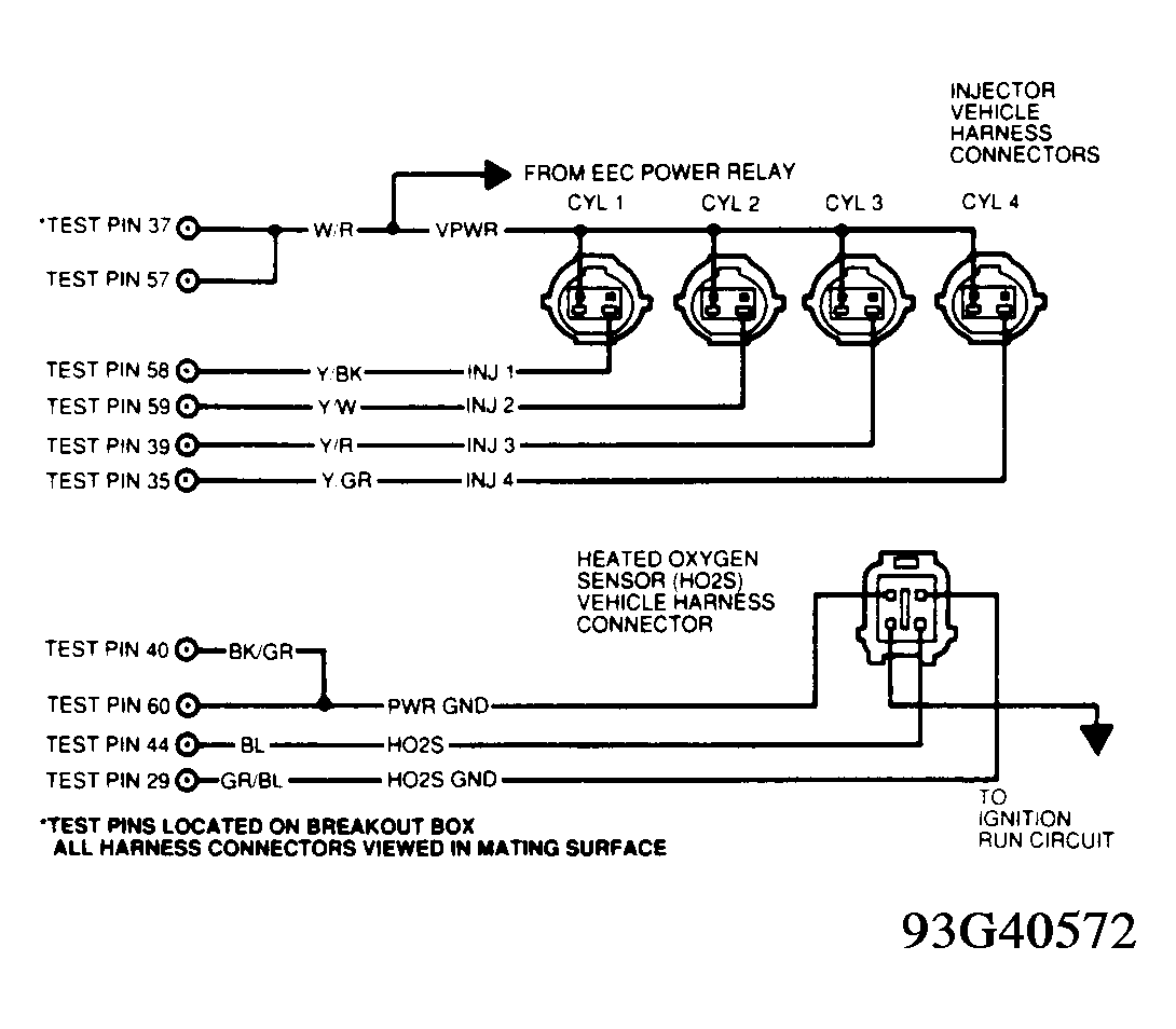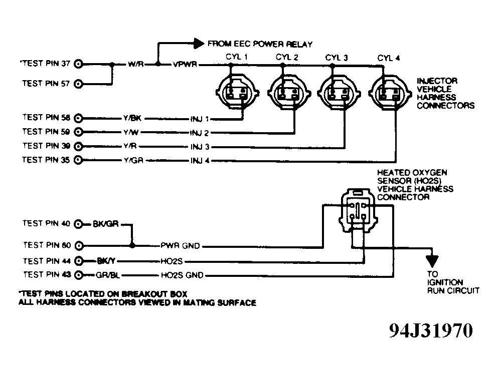 116) Check Left/Front HO2S Circuit For Short To Power Turn ignition off. Disconnect 60-pin PCM connector. Inspect terminals, and repair if damaged. Install EEC-IV Breakout Box (T83L-50-EEC-IV), leaving PCM disconnected.