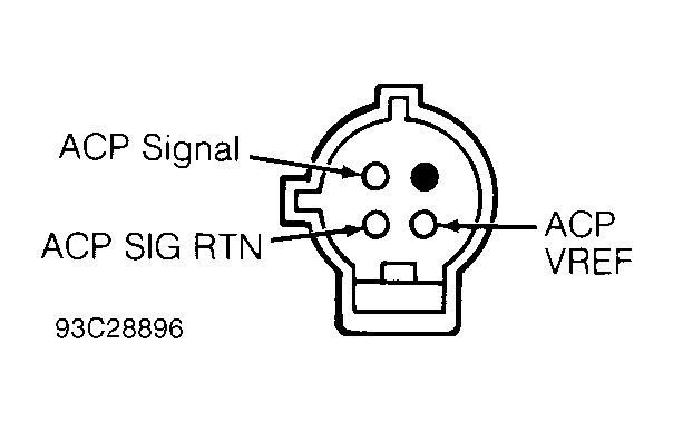 If Continuous Memory Code 586 is present, repair fault causing code prior to continuing this test. See step 80). If Code 586 is not present, turn ignition off. Disconnect ACP sensor. Turn ignition on. Measure voltage between ACP VREF terminal (Orange/Light Blue wire) and ACP SIG RTN terminal (Light Blue/Red wire) at ACP sensor connector. See Fig 2. If voltage is more than 6 volts, go to step 62). If voltage is less than 4 volts, go to step 63). If voltage is 4-6 volts, go to next step.