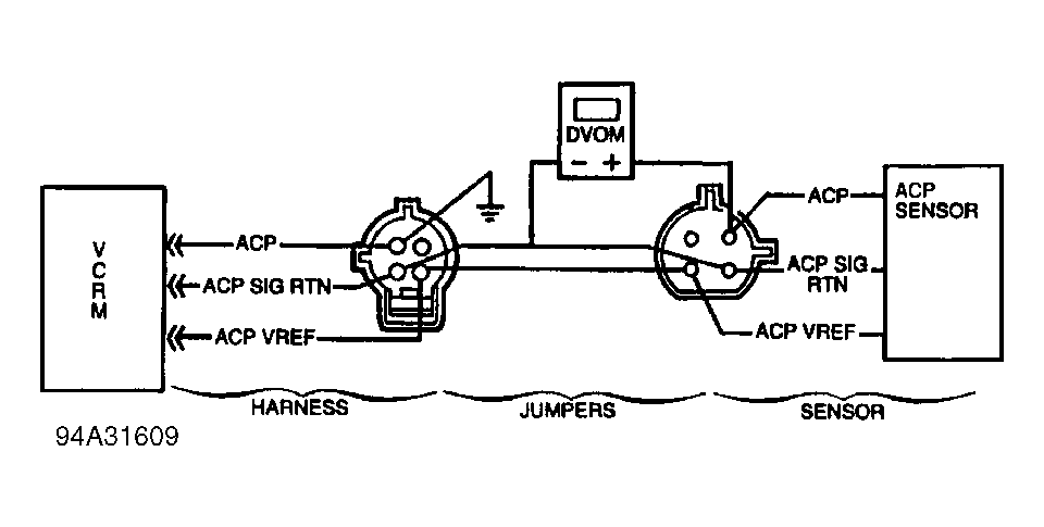 54) Check ACP Sensor Output  Turn ignition off. Ensure ACP sensor is disconnected. Install A/C system manifold gauge set. Connect jumper wires and DVOM between ACP sensor connector halves as shown. See Fig 3. Start engine and observe voltage reading on DVOM. Turn A/C on and observe voltage reading for 10 seconds after clutch engages.