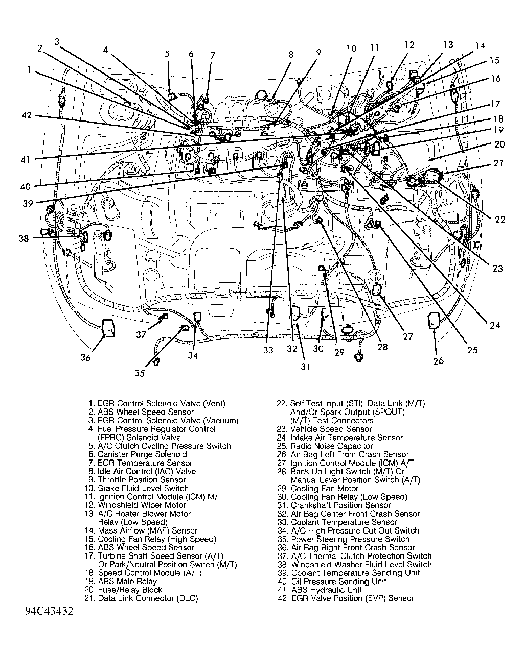 In engine bay, on left inner fender panel. See