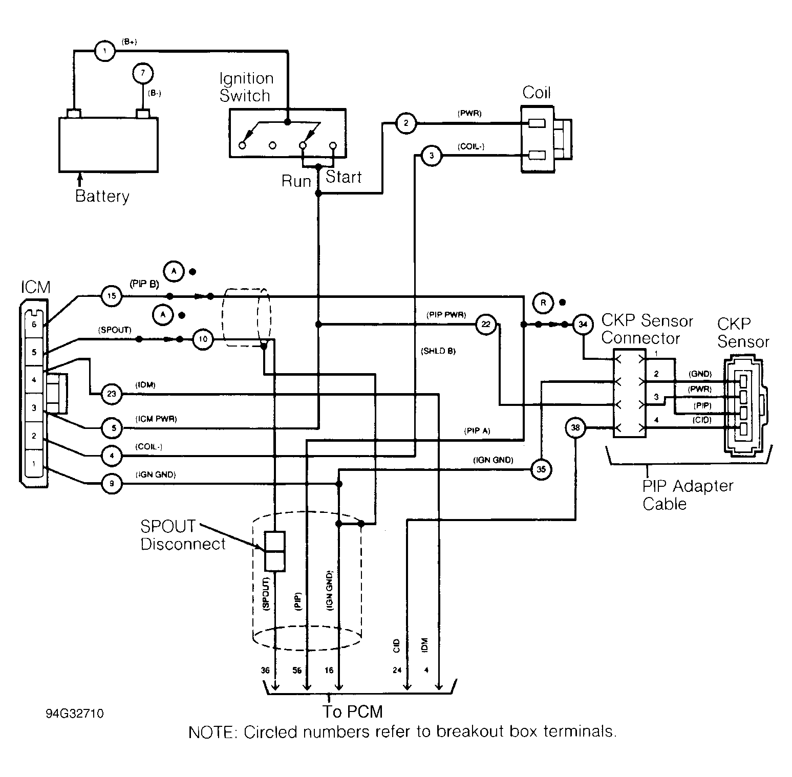 - Connect Test Equipment Turn ignition off. Connect DI Diagnostic Cable (007-00097) to EEC-IV Breakout Box (T83L-50-EEC-IV), negative battery terminal and ICM. See Figure. Leave B+ lead disconnected. Ensure PIP OPEN/NORMAL/SPOUT OPEN switch is in NORMAL position. Use DI overlay on breakout box. Disconnect PCM and go to next step.
