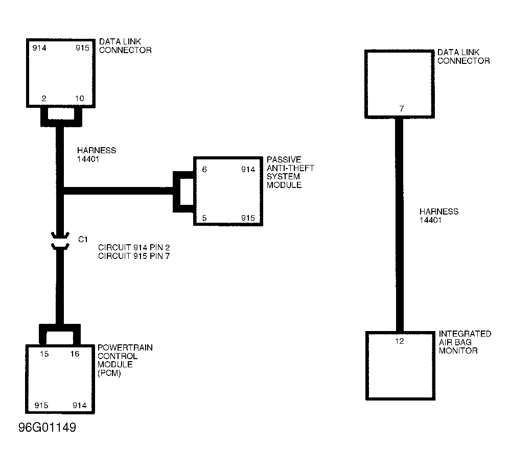 6. Measure resistance between Data Link Connector (DLC) pin No. 10 (Pink/Light Blue wire) and harness connector No. 1 Pink/Light Blue wire terminal. If resistance is less than 5 ohms, go to next step. If resistance is 5 ohms or more, replace circuit No. 914 (Tan/Orange wire) and circuit No. 915 (Pink/Light Blue wire).