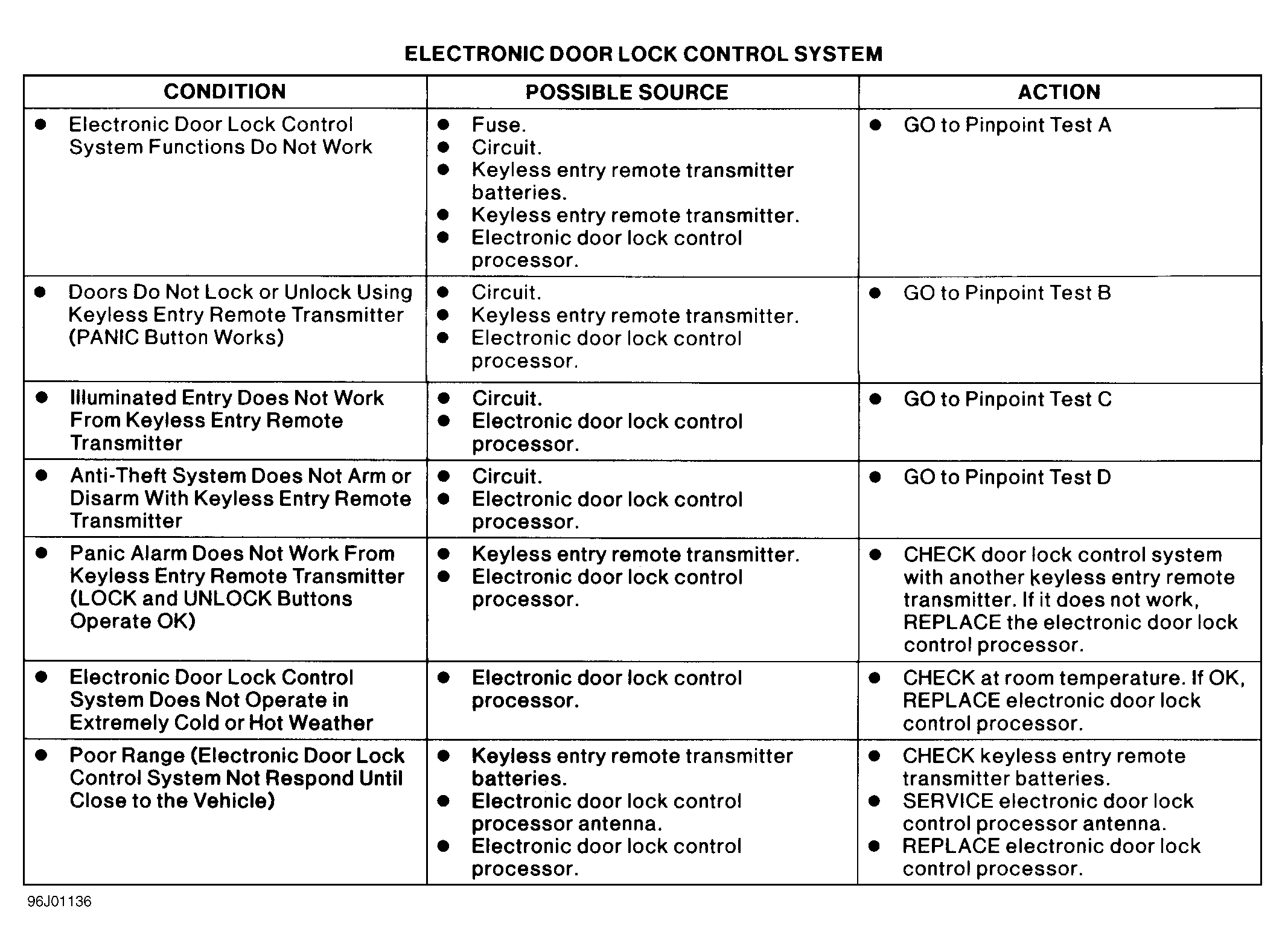 Home >> Ford >> 1996 >> Probe Base, Standard >> Repair and Diagnosis (Single Page) >> Accessories & Equipment >> Anti-Theft Systems >> Remote Keyless Entry Systems >> Testing >> Pinpoint Test D - Anti-Theft System Does Not Operate From Remote Transmitter