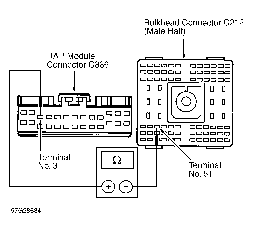 - Measure resistance of Light Blue/White wire between RAP module connector C336, terminal No. 3 and bulkhead connector C212 (male half), terminal No. 51. See Fig 1. If resistance is less than 5 ohms, repair open in Light Blue/White wire between bulkhead connector C212 (female half) and DLC and retest system. If resistance is more than 5 ohms, repair open in Light Blue/White wire between RAP module connector C336 and bulkhead connector C212 and retest system.