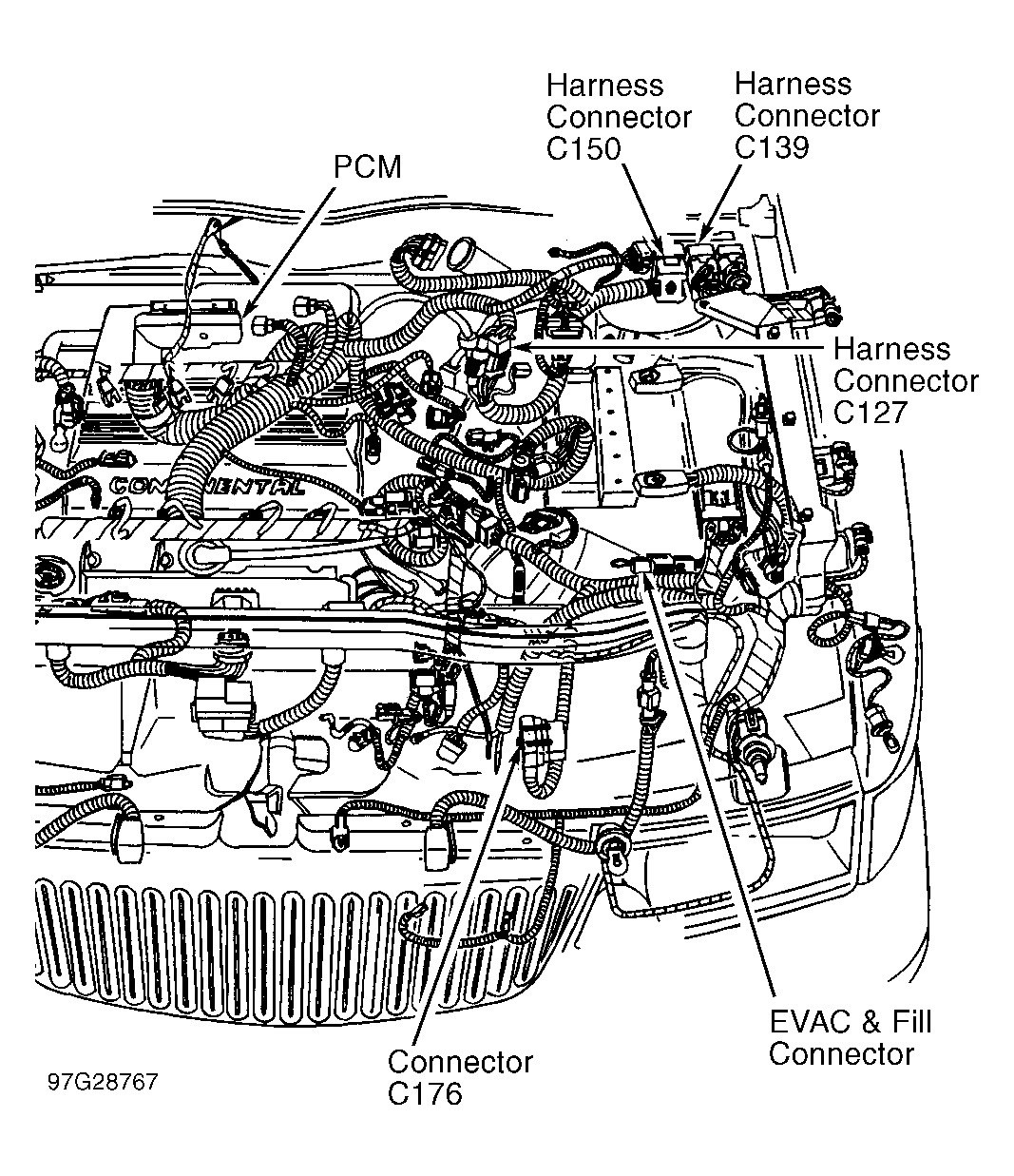 21. Inspect pins and wire connections on harness connectors C127, C150 and connector C1032 for PCM. If pins and wire connections are okay, replace PCM. Repeat TEST A  . If pins or wire connections are defective or damaged, repair pins or wire connections as necessary. Repeat TEST A  .