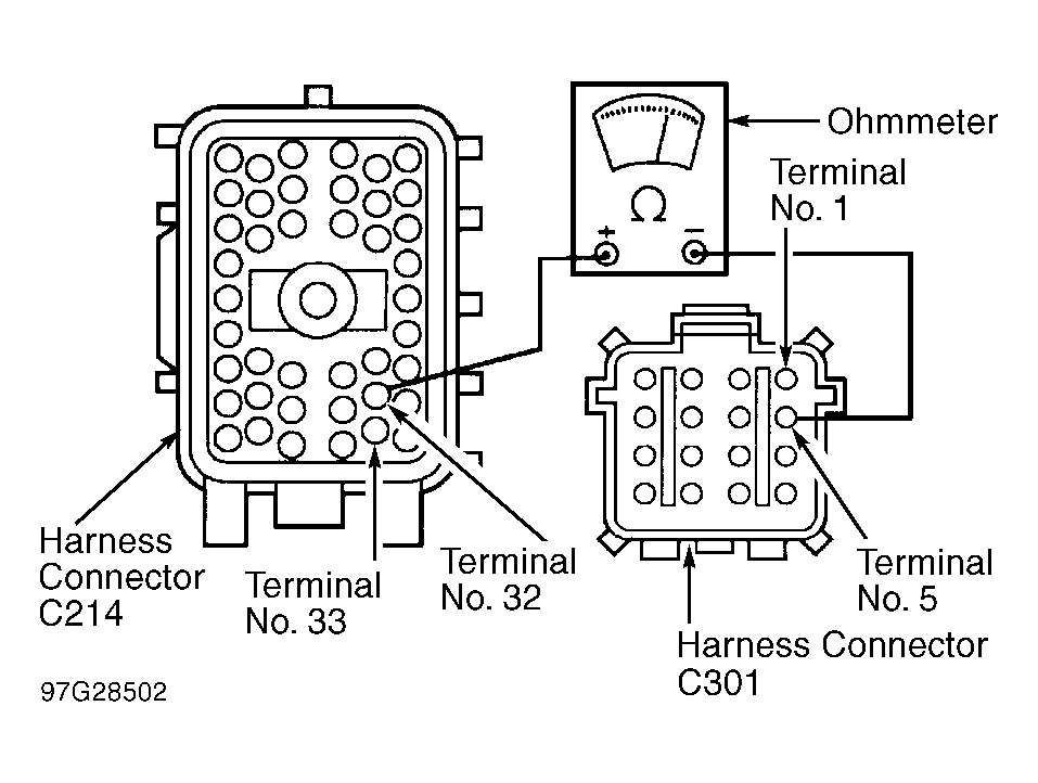 - Using ohmmeter, check resistance between terminal No. 1 (Pink/Light Blue wire) on female side of harness connector C301 and terminal No. 33 (Pink/Light Blue wire) on male side of harness connector C214. See Fig 1 . Note resistance and go to next step.