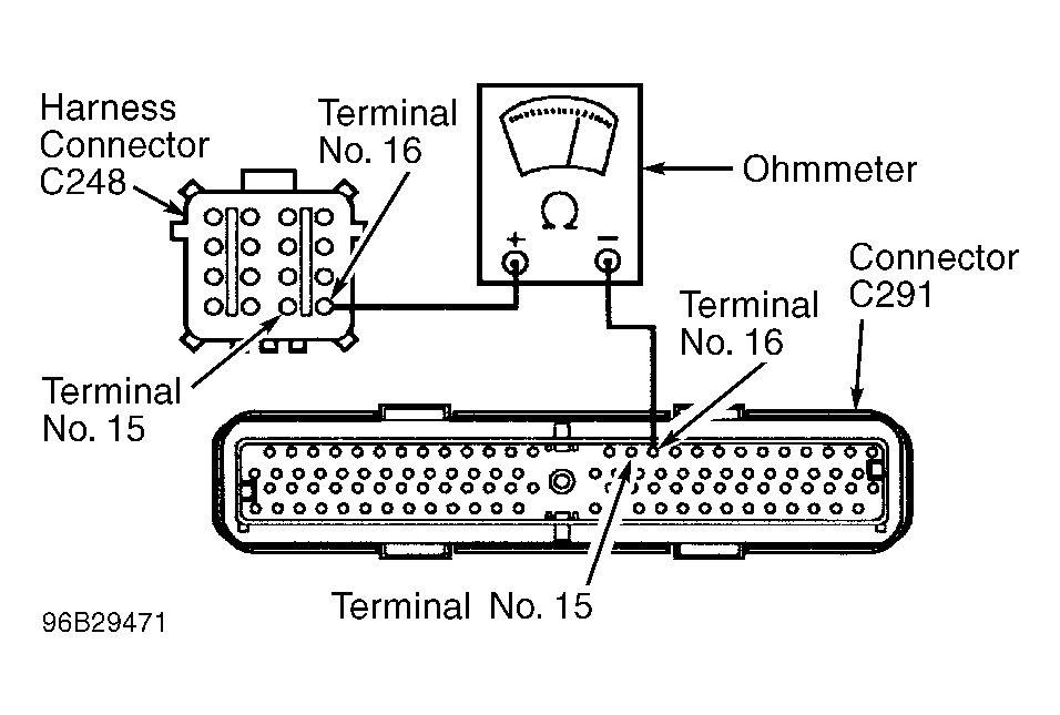 7. Using ohmmeter, check resistance between terminal No. 15 (Pink/Light Blue wire) on male side of harness connector C248 and terminal No. 15 (Pink/Light Blue wire) on connector C291. See Fig 1 . Note resistance and go to next step.