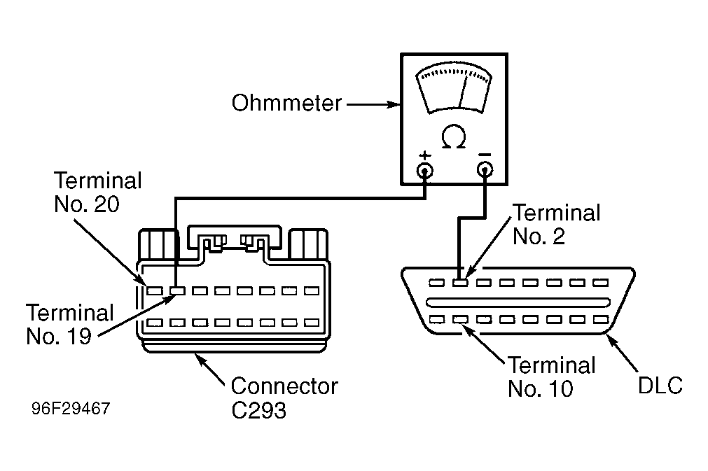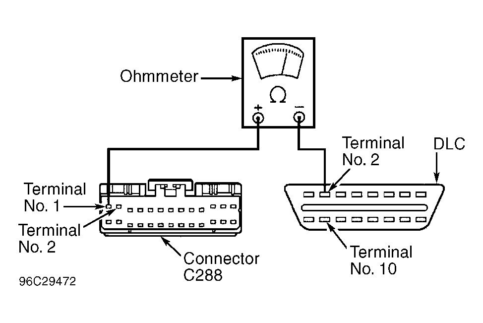 3. Using ohmmeter, check resistance between terminal No. 2 (Pink/Light Blue wire) on connector C288 and terminal No. 10 (Pink/Light Blue wire) on DLC. See Figure . Note resistance and go to next step.