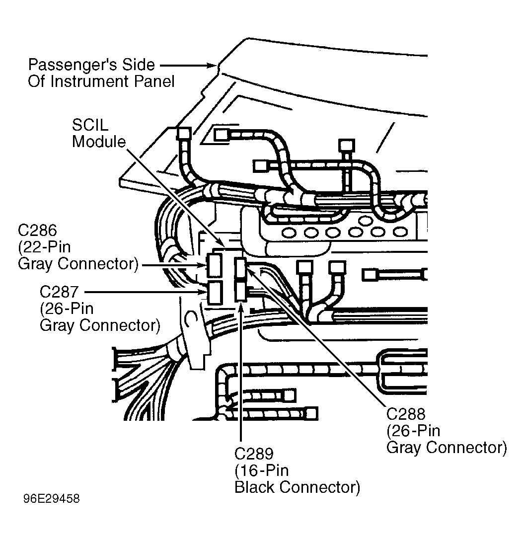 1. Ensure ignition switch is in OFF position. Disconnect connector C288 from SCIL module. See Figure . SCIL module is located behind passenger's side of instrument panel, to the right of glove box. SCIL module contains one 16-pin connector, one 22-pin connector and two 26-pin connectors.