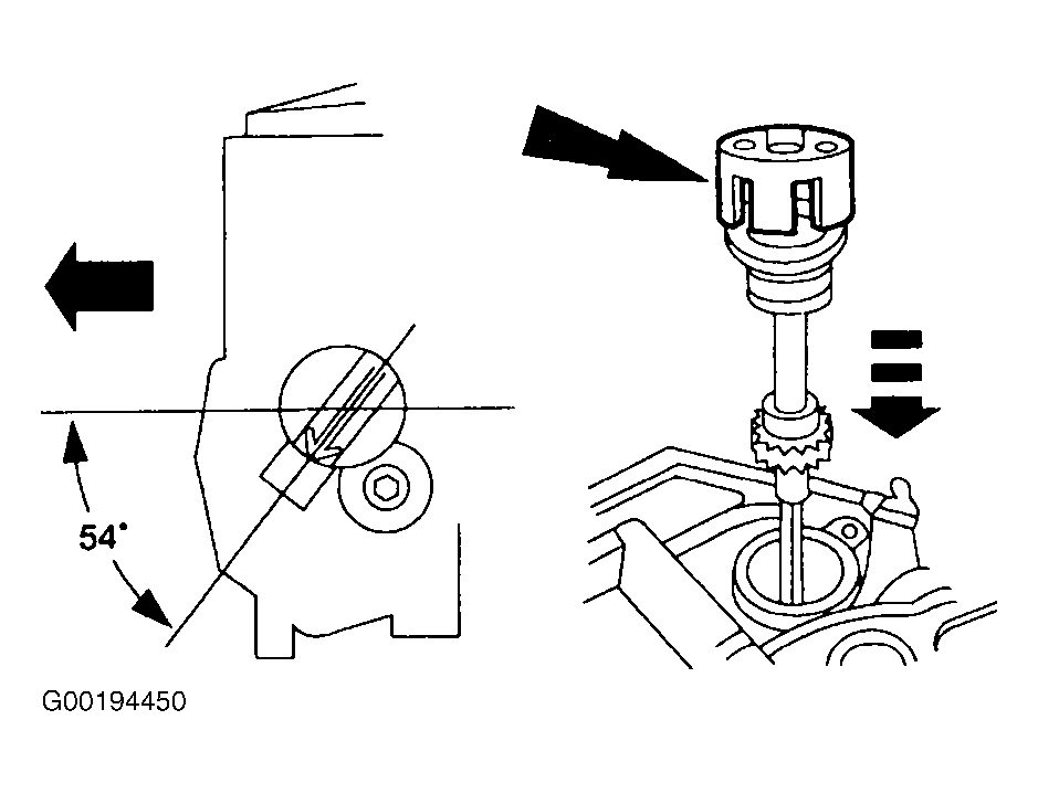 2. Install camshaft synchronizer housing assembly so the arrow on the Install Synchro Positioning Tool (303-630) is 54 degrees from centerline of the engine. See Fig 2.