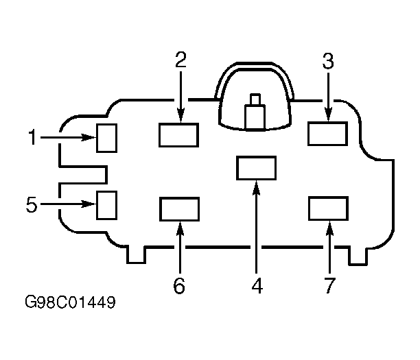 Disconnect passenger's window regulator control switch. Check continuity between specified passenger's window regulator control switch terminals with switch in appropriate position. See PASSENGER'S WINDOW REGULATOR CONTROL SWITCH table. See Fig 1 . If continuity is not as specified, replace passenger's window regulator control switch.