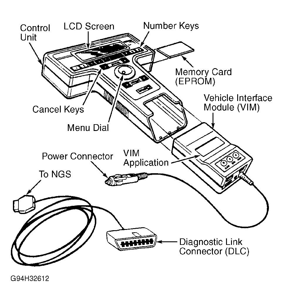 Turn ignition switch to OFF position. Ensure proper memory (EPROM) card is inserted into NGS scan tool. Connect service connectors of adapter cable to vehicle Data Link Connector (DLC) and the NGS scan tool. See Fig 1. Connect NGS scan tool power supply cable to power and go to KOEO ON-DEMAND SELF-TEST.