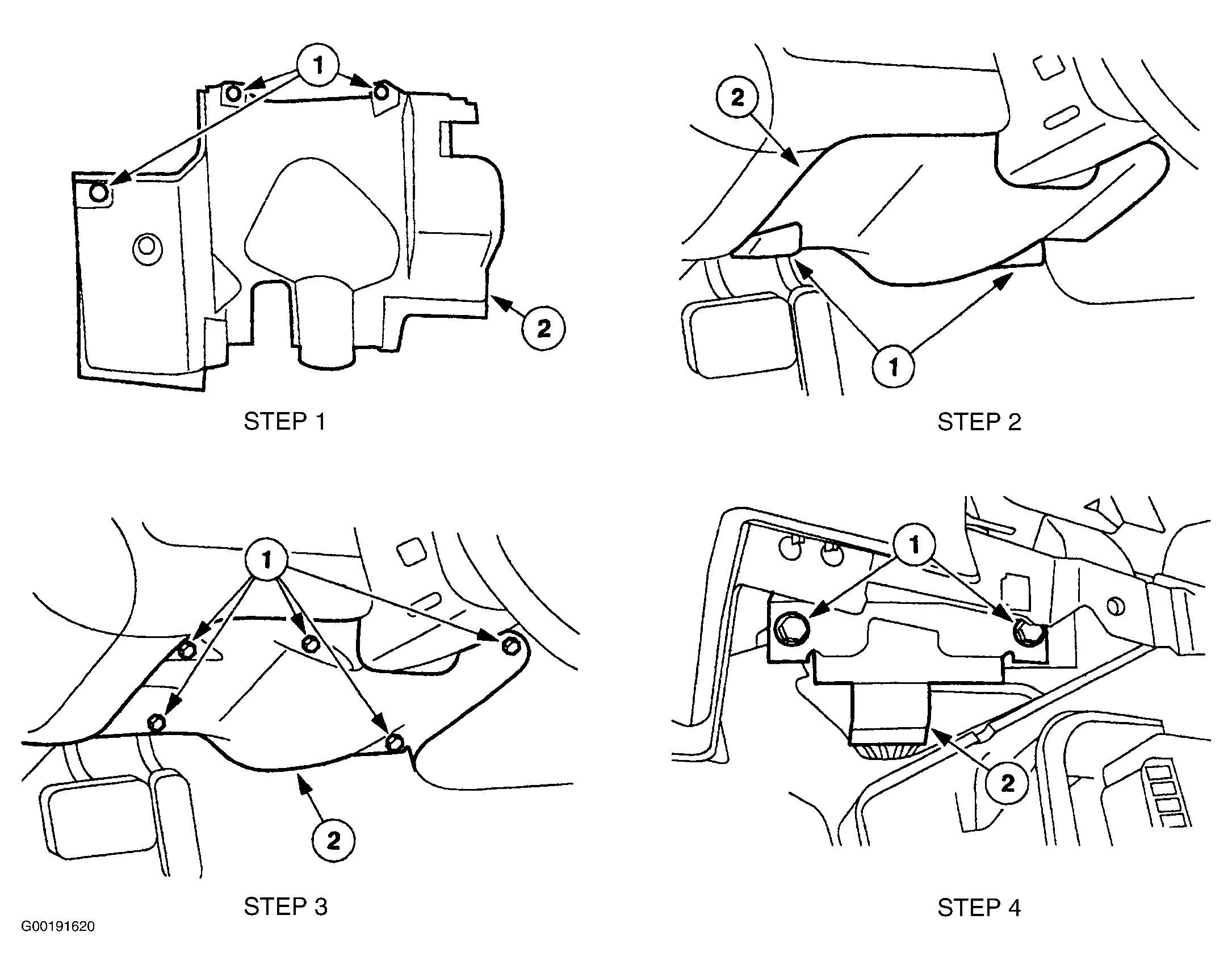 Disconnect negative battery ground cable. Remove driver's side instrument panel lower insulator pin-type retainers. Remove instrument panel lower insulator. See STEP 1 in Fig 1. Remove lower steering column cover screws. Remove lower steering column cover. See STEP 2 in Fig 1. Remove lower steering column cover reinforcement screws. Remove lower steering column cover reinforcement. See STEP 3 in Fig 1. Remove PATS module bolts and bracket. Disconnect harness connector and remove module. See STEP 4 in Fig 1. To install, reverse removal procedure.