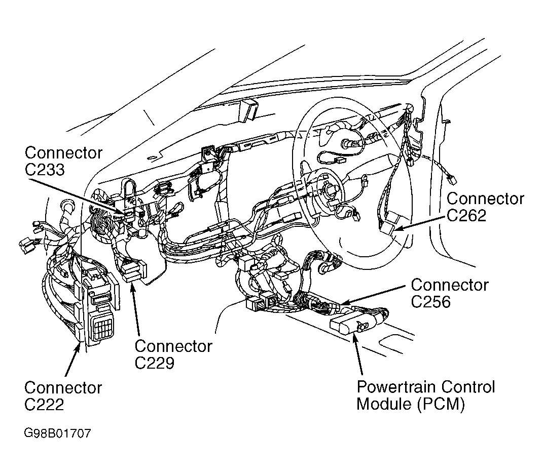 5. Turn ignition switch to LOCK position. Disconnect in-line harness connector C256 (White). In-line harness connector C256 is located near PCM. See Figure. Turn ignition switch to ON position. Measure voltage between DLC terminals No. 2 (White/Blue wire) and No. 4 (Black wire), then between DLC terminals No. 2 (White/Blue wire) and No. 16 (Green wire). If voltage exists for either measurement, repair White/Blue wire as necessary between in-line harness connector C256 and DLC. Retest system for normal operation. If voltage does not exist for both measurements, repair White/Blue wire as necessary between in-line harness connector C256 and PCM. Retest system for normal operation.