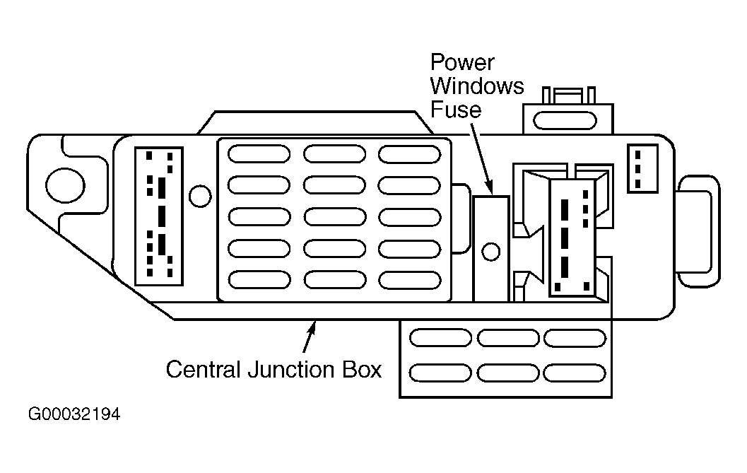 For location of Central Junction Box (CJB) harness connectors and relay box, refer to illustration. See Fig 1. For location of power window fuse in CJB, refer to illustration. See Fig 2. Power window fuse may also be referred to as power window circuit breaker.