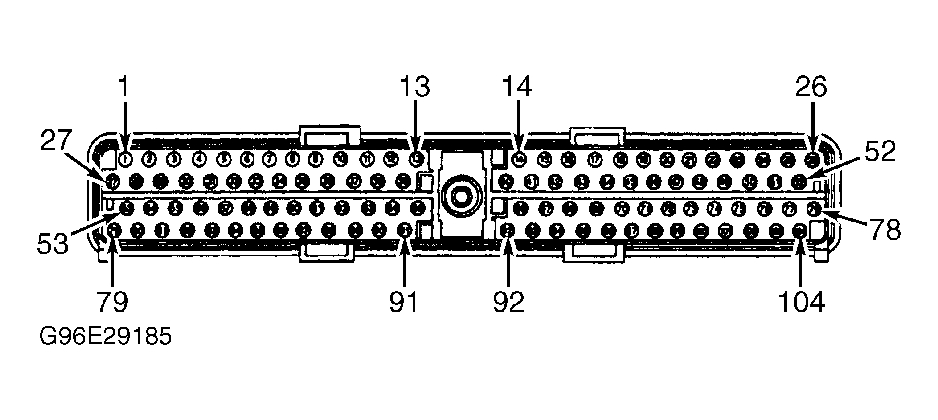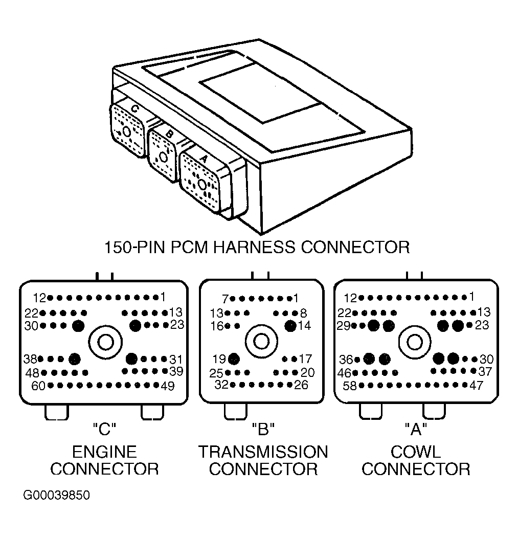 1. Turn ignition off. Locate Powertrain Control Module (PCM). See POWERTRAIN CONTROL MODULE LOCATION  table. Using a DVOM, check continuity between ground and PCM connector terminals. See IDENTIFYING PCM GROUND TERMINALS  table. See Figure-Figure . If continuity does not exist, repair open ground circuit as necessary. If continuity exists, go to next step.