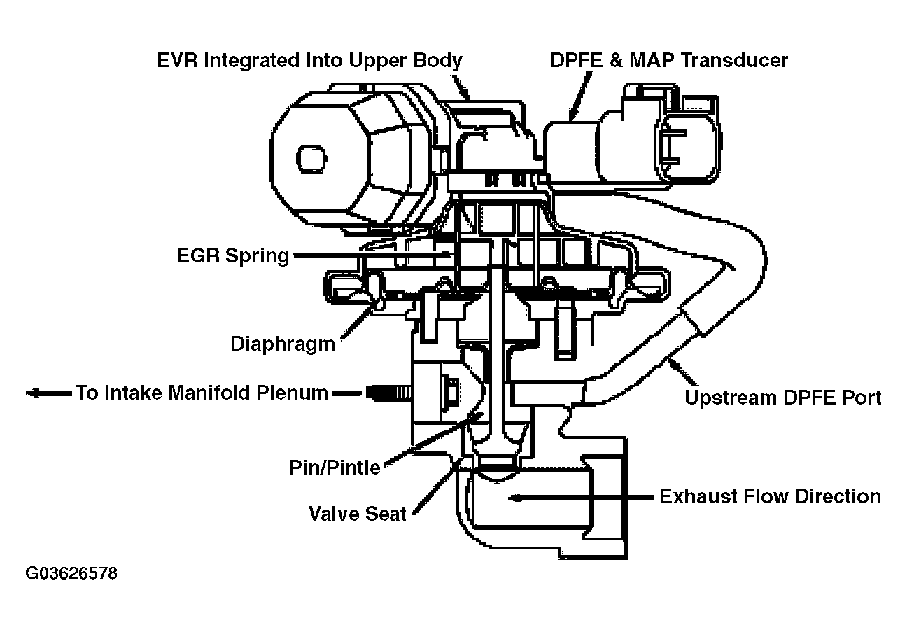 After the vehicle has warmed up and normal EGR rates are being commanded by the PCM, the low flow check is performed. Since the EGR system is a closed loop system, the EGR system will deliver the requested EGR flow as long as it has the capability to do so. If the EVR duty cycle is very high (greater than 80% duty cycle), the differential pressure indicated by the DPFE sensor is evaluated to determine the amount of EGR system restriction. If the differential pressure is below a calibratable threshold, a low flow malfunction in indicated (P0401/P0406).