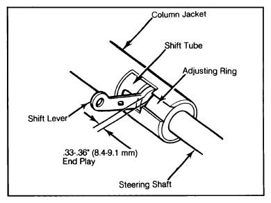 Place shift tube lever in "N" or "D". Loosen adjusting ring clamp screws and rotate adjusting ring to obtain 0.33 - 0.36" (8.4-9.1 mm) end play between shift tube lever and adjusting ring. Tighten adjusting ring clamp screws. See Fig 1.