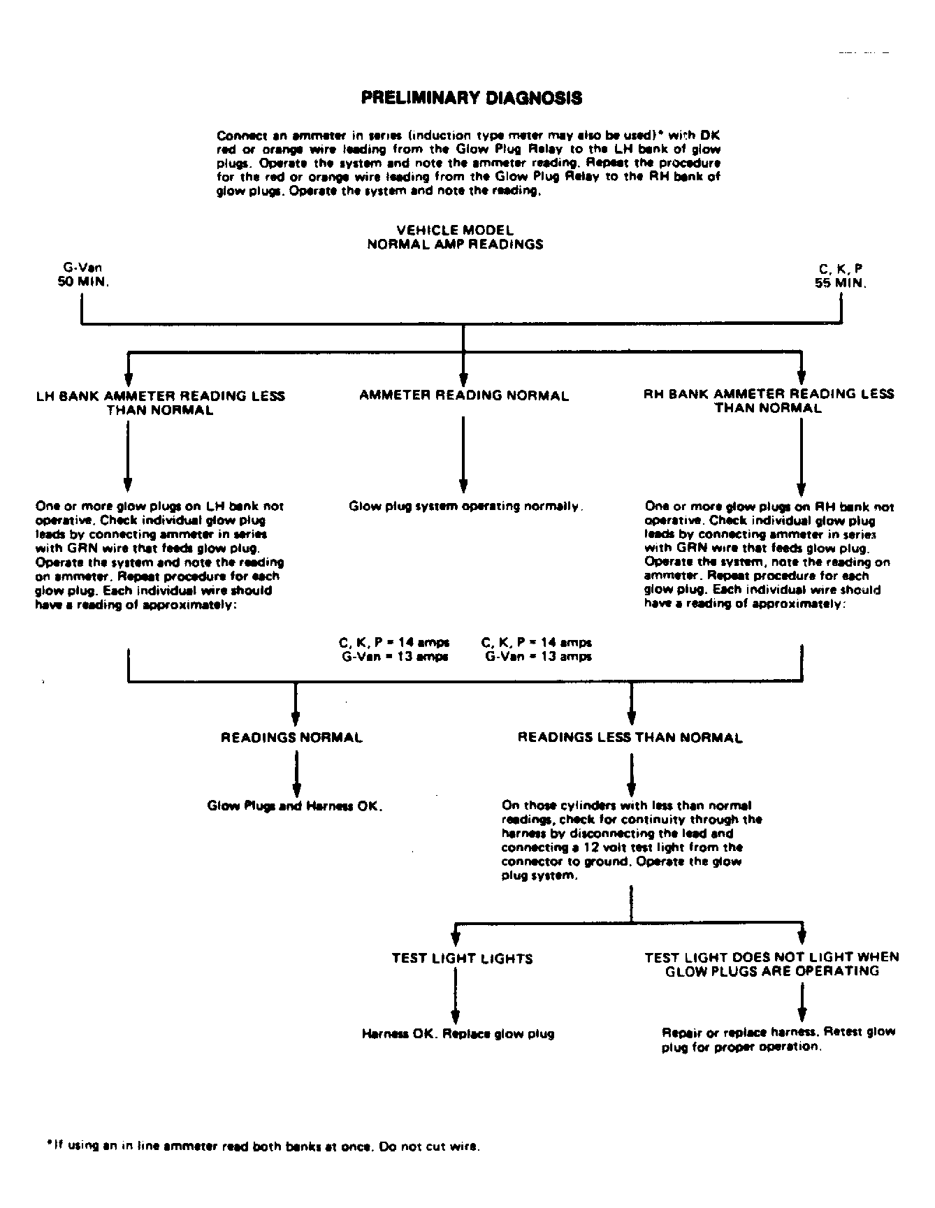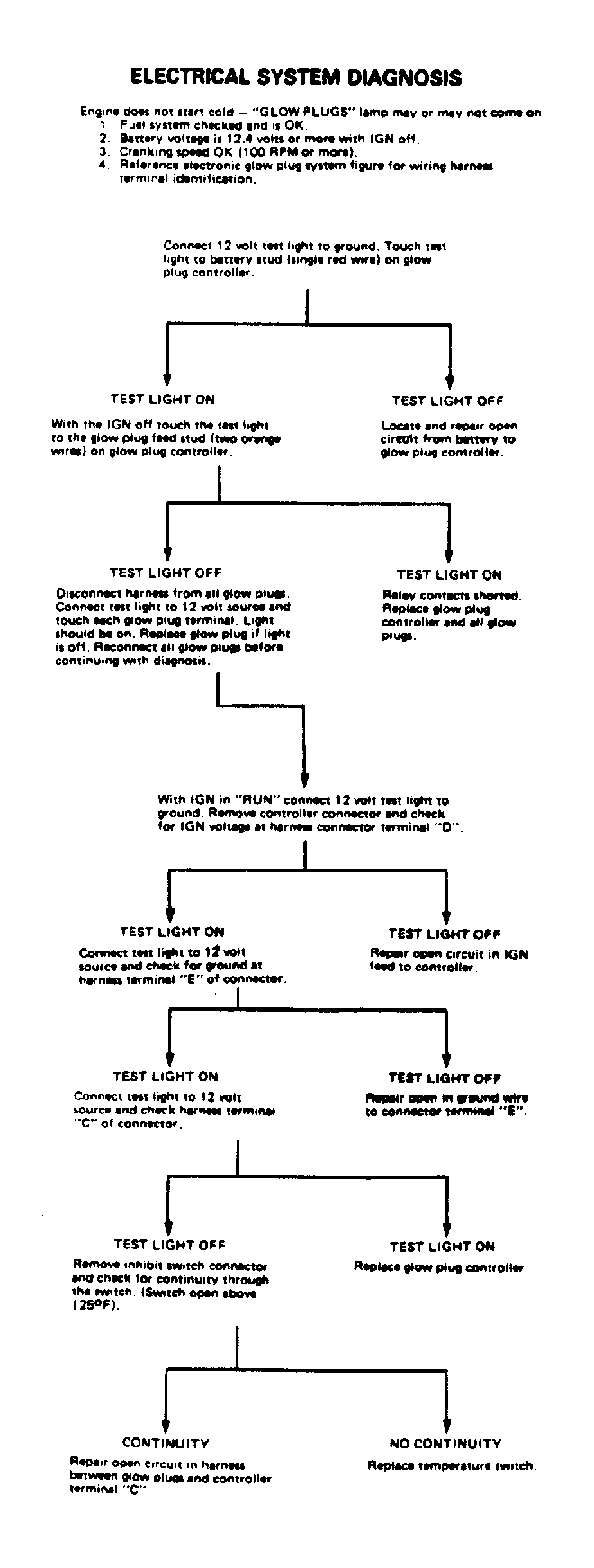 The PRELIMINARY DIAGNOSIS chart provides a quick procedure for determining if a problem exists in the glow plug system itself, or elsewhere in the electrical system. See Fig 2. This test should always be completed before proceeding with the ELECTRICAL SYSTEM DIAGNOSIS chart. See Fig 3.