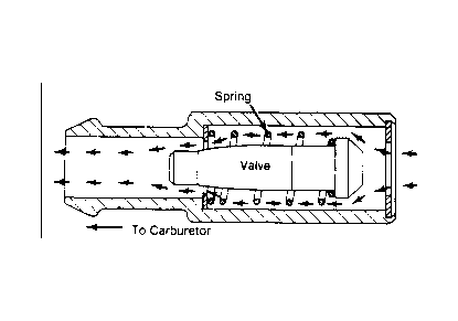 Ventilator valve is held closed by spring pressure when engine is not running. See Fig 2 . This prevents accumulation of hydrocarbon fumes from collecting in intake manifold, which could result in hard starting.