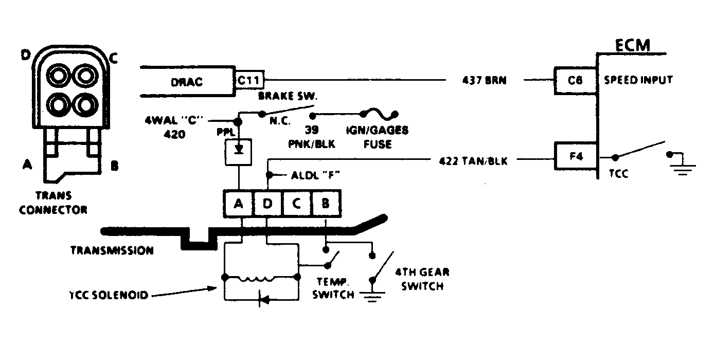- Connect a test light to battery voltage. Touch TCC control driver terminal with test light. See Figure - Figure . Accelerate vehicle to 45 MPH and note test light. If test light does not illuminate, problem is a faulty ECM connector or ECM. On some models, lock-up signal may be checked at ALDL connector terminal "F" instead of at ECM terminal.
