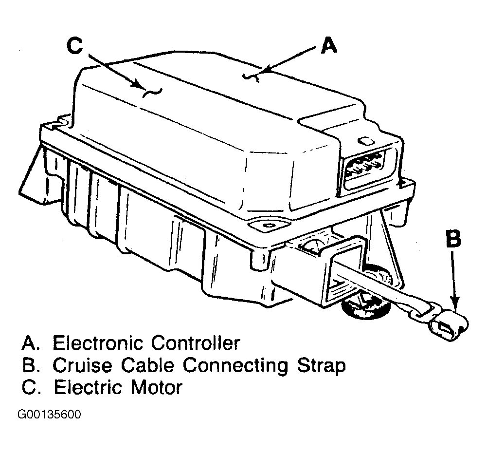 The cruise control module is mounted on the upper radiator support. The cruise control module has an electronic controller and an electronic stepper motor to vary the throttle with each different cruise control mode. The cruise control module is not serviceable. See Fig 1.