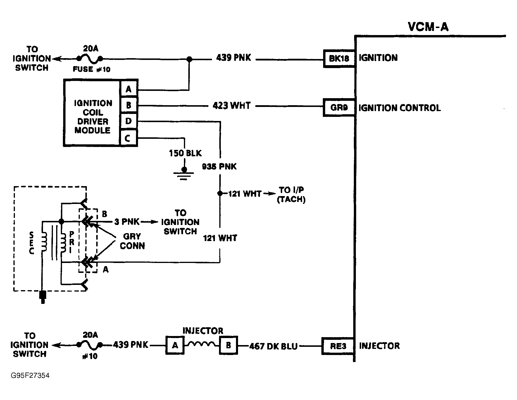 - Turn ignition off. Disconnect Gray VCM-A harness connector. Check for continuity between VCM-A ignition control connector terminal and ignition driver module connector terminal "B". If continuity is present, go to next step. If continuity is not present, check for open IC circuit between VCM-A and ignition coil driver module.