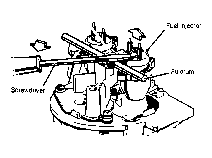 1. Relieve fuel pressure. See FUEL SYSTEM PRESSURE RELIEF (TBI) under FUEL SYSTEM . Disconnect fuel injector electrical connector. Remove fuel meter cover assembly (TBI 220, or fuel meter body cover (TBI 295), leaving cover gasket in place. Using screwdriver and fulcrum, pry injector out. See Figure. Remove small "O" ring from nozzle end of injector.