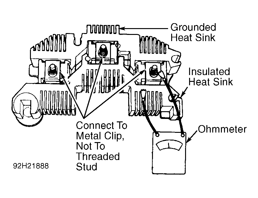 - Repeat test between insulated heat sink and 3 flat metal rectifier bridge terminal connectors. Replace rectifier bridge if readings are the same when leads are reversed at any test connection.