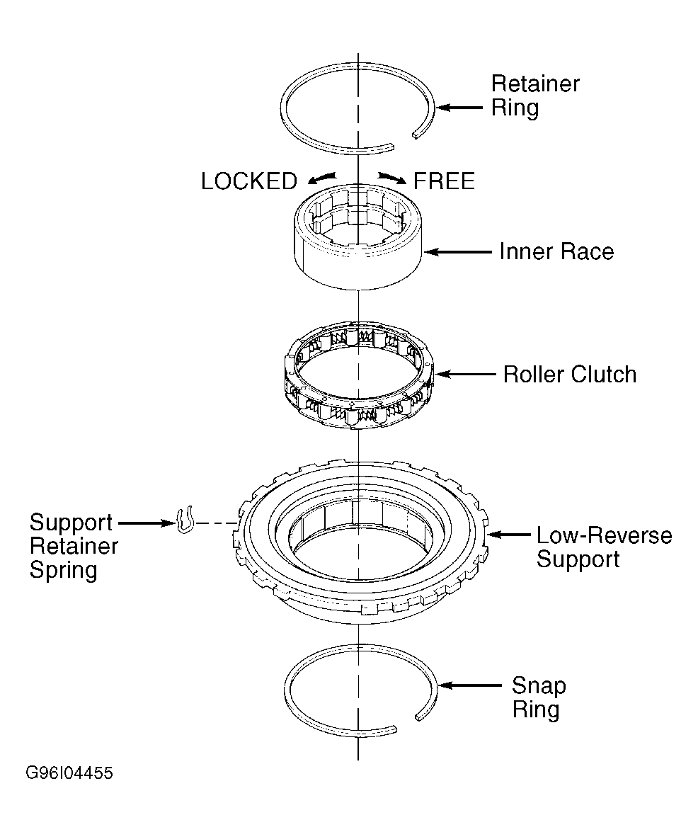 - Install roller clutch assembly in low-reverse support. See Fig 1. Place support in case with hub facing downward. Install inner race. Rotate inner race while pushing downward. Use care not to damage roller and springs during installation.