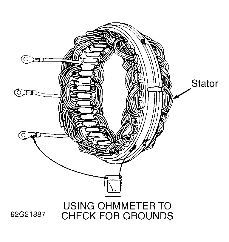 2. Using ohmmeter, check for grounds between any stator lead and stator frame. See Fig 1. Ohmmeter should indicate infinite resistance. If reading is not infinity, replace stator. CS series generators are equipped with delta stator windings and cannot be checked for opens or shorts using ohmmeter. A noticeable discoloration anywhere on the stator usually indicates stator failure.