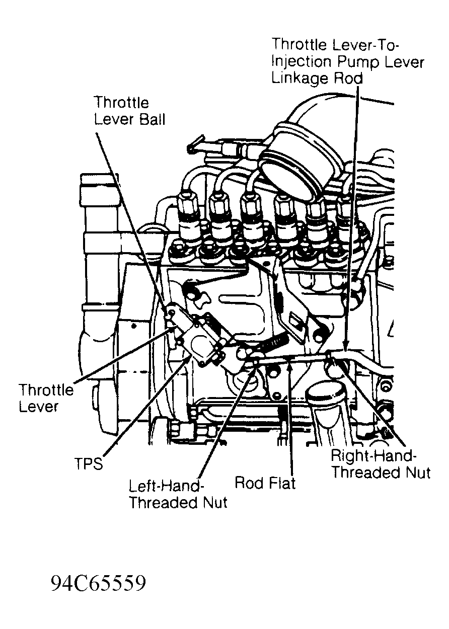 - Check WOT operation. Press accelerator pedal approximately half-way to floor. Throttle lever and throttle lever-to-injection pump lever linkage rod should both move. Continue pressing accelerator pedal to floor. If throttle lever break-over is operating properly, throttle lever-to-injection pump lever linkage rod should have stopped moving while throttle lever moves toward rear of engine. Verify correct low idle speed.